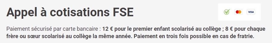 Paiement par CB (voir ci-dessous) de préférence, ou éventuellement par chèque à l’ordre du FSE. Dans ce dernier cas, merci d’inscrire le nom de l’élève au dos, à remettre au professeur principal à la rentrée.
